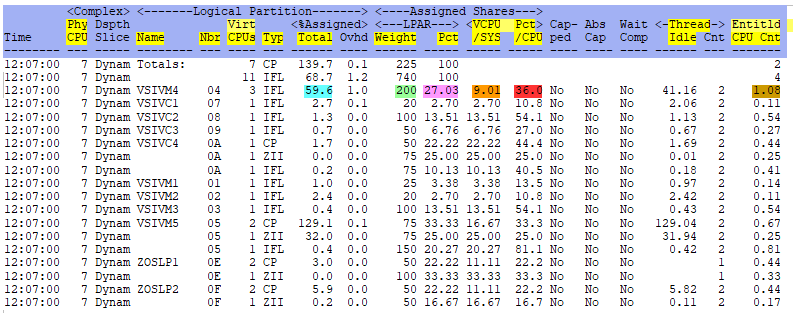 - LPAR ZVMPRD has 10 vCPUs with a weight of 650. It is using 333.7% or a little over 3 out of 10 CPUs worth of processing. It could be lowered to 8 or 9 vCPUs.